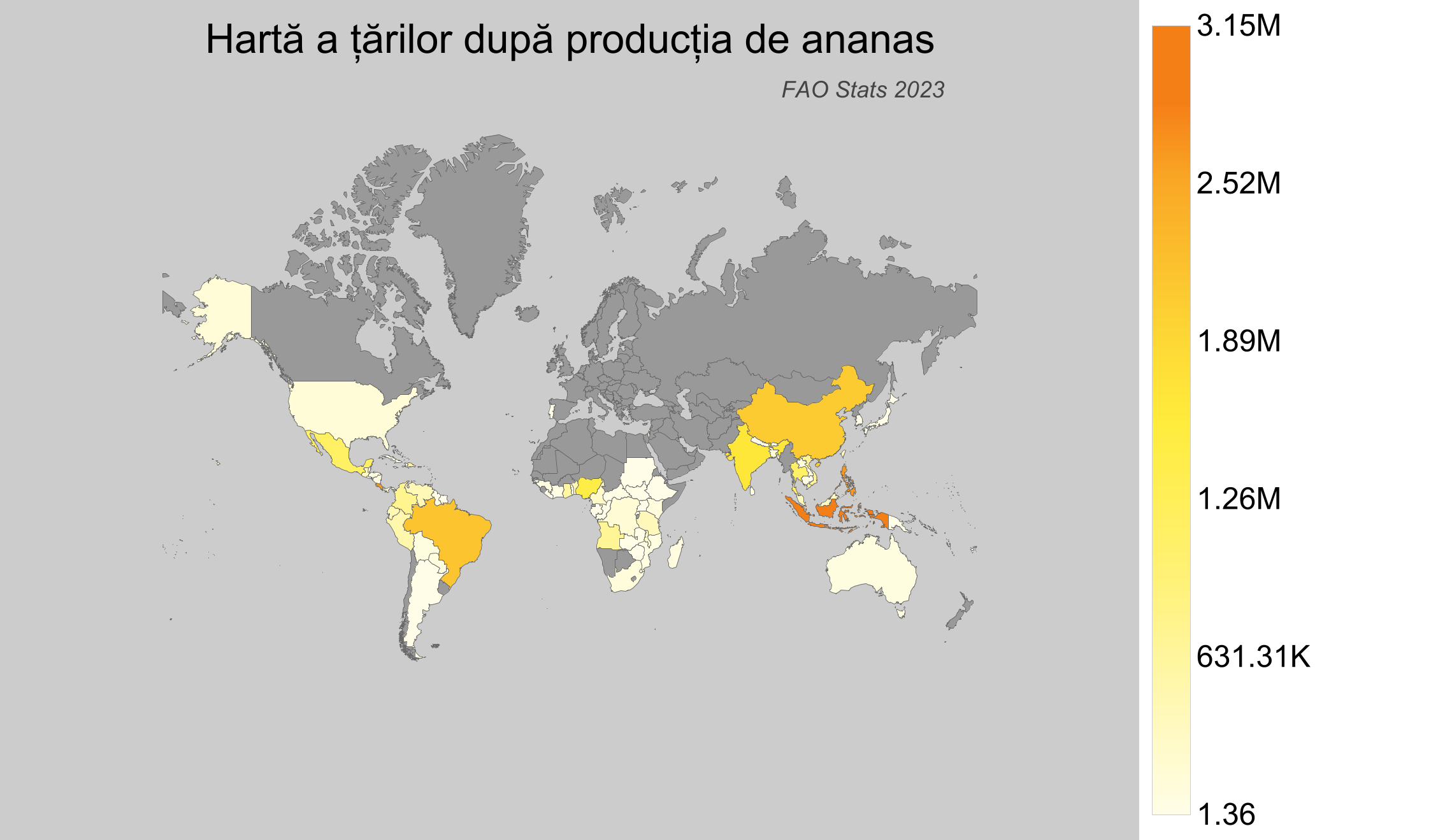- Indonezia este liderul mondial în producția de ananas în 2023, cu aproximativ 3,16 milioane de tone.